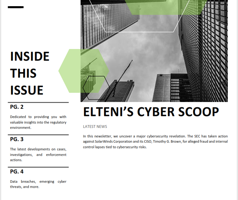 ELTENI'S CYBER SCOOP Latest News In this newsletter, we uncover a major cybersecurity revelation. The SEC has taken action against SolarWinds Corporation and its CISO, Timothy G. Brown, for alleged fraud and internal control lapses tied to cybersecurity risks. Want to download this in pdf? Enter the password from the email you received.